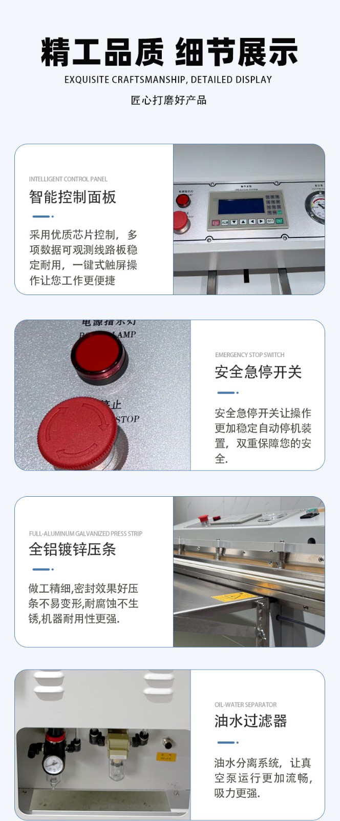 - 放入空白包裝袋,進行真空封口測試,檢查封口是否平整、無漏封、無焦糊(若封口不牢,可適當調整溫度;若焦糊,需降低溫度或時間)。